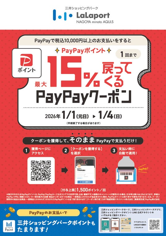 事前にPayPay内でクーポンを取得いただき、対象店舗にてPayPayをご利用のうえお支払いいただくと最大15%分のPayPayポイントが後日付与されます!