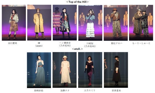 ヨーロッパ・アメリカでバイヤーがセレクトした古着やオリジナル・インポートクローズを圧倒的な商品量で取り揃え、その時代のカルチャーを築いた上質なアイテムで新しいスタイルを提案するヴィンテージショップTop of the Hill(トップオブザヒル)によるファッションショーでは、現代のエッセンスを加えたヴィンテージルックを披露。次世代女優出口夏希がクラシカルな雰囲気が漂うウエスタンスタイルを着こなし、さらに、日本人7人組ボーイズグループaoenのメンバー輝がエレガントなスタイリングで存在感を見せました。乃木坂46からは、TGC初出演の一ノ瀬美空、川崎桜が登場し、華やかなフリルが主役となるスタイリングでランウェイを彩りました。そして、超特急のメンバー高松アロハやマルチに活躍するもーりーしゅーとがグランジテイストなルックでショーを盛り上げ、ブランドの多彩な世界観を見せつけました。