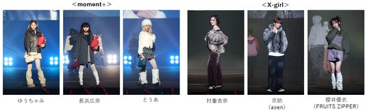 “REAL GIRLʼS CLOTHING”をテーマに、時代の変化に寄り添いながらリアルな女の子のストリートスタイルを提案し続けるX-girl(エックスガール)のステージは、90’sストリートやグランジをテーマにNYブルックリンを彷彿とさせる演出で展開。国民的タレントで自身初となるファッション誌のカバーが大きな話題を呼んでいる村重杏奈は、ベアトップで肩を大胆に見せたスタイルにオーバーサイズのファーコートと、ポインテッドトゥを合わせた大人ストリートな着こなしを。日本人7人組ボーイズグループaoenのメンバーで本ステージがランウェイデビューとなる京助は、グレーのファージャケット×ワイドボトムによるスタイリングで存在感を放ち、FRUITS ZIPPERの櫻井優衣は、美脚が際立つミニスカートにレッグウォーマーを合わせ、X-girlらしいストリートガーリーなムードをまとって登場しました。