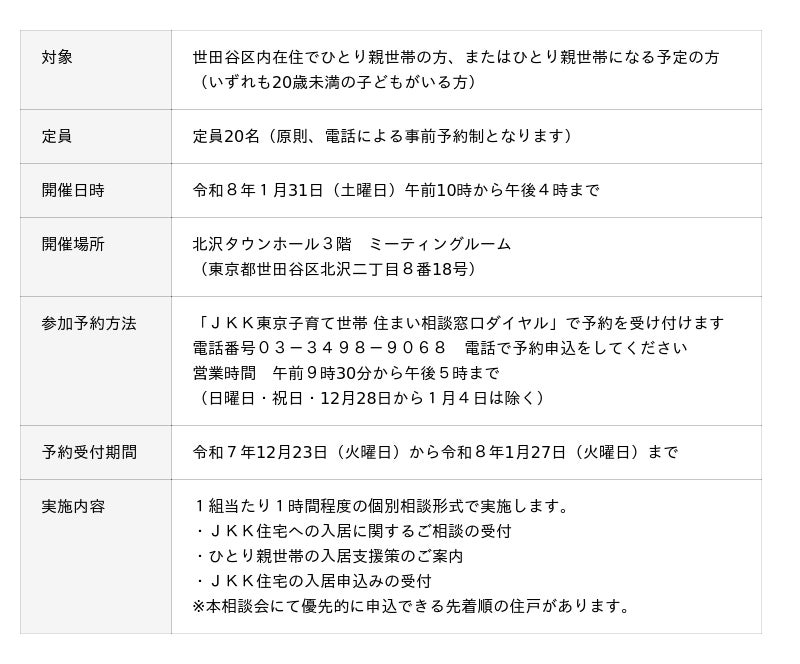 JKK東京(東京都住宅供給公社:東京都渋谷区、理事長:浜佳葉子、以下「JKK」)は、ひとり親世帯の住まい探しをサポートするため、「ひとり親家庭のためのJKK東京住宅相談会」を令和8年1月31日(土曜日)に、世田谷区と共同で開催します。