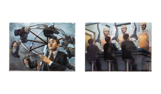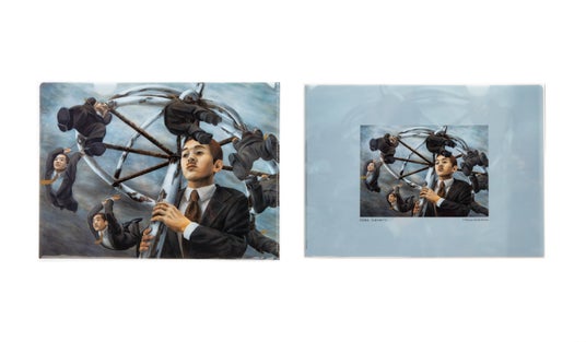 本作は《飛べなくなった人》と同様に遊園地の遊具を題材にした作品の一つです。社長の権力の傘下で動くほかないサラリーマンの悲哀が、社長が回す遊具にぶら下がる姿で文字通りに表現されています。下からのアングルで描かれたサラリーマンの姿は、どことなく滑稽さも帯びています。