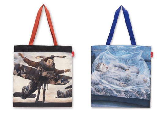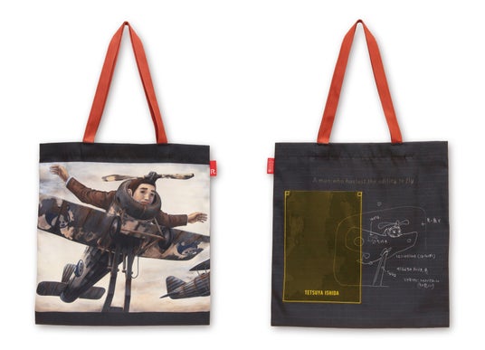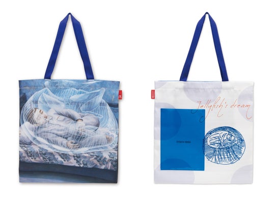 石田作品を面で大きく魅せることができるトートバッグは、石田徹也の代表作であり人気のある《飛べなくなった人》と、柔らかくて繊細な布の素材に合う《クラゲの夢》の、対極の印象を持つ2作品をモチーフにしました。