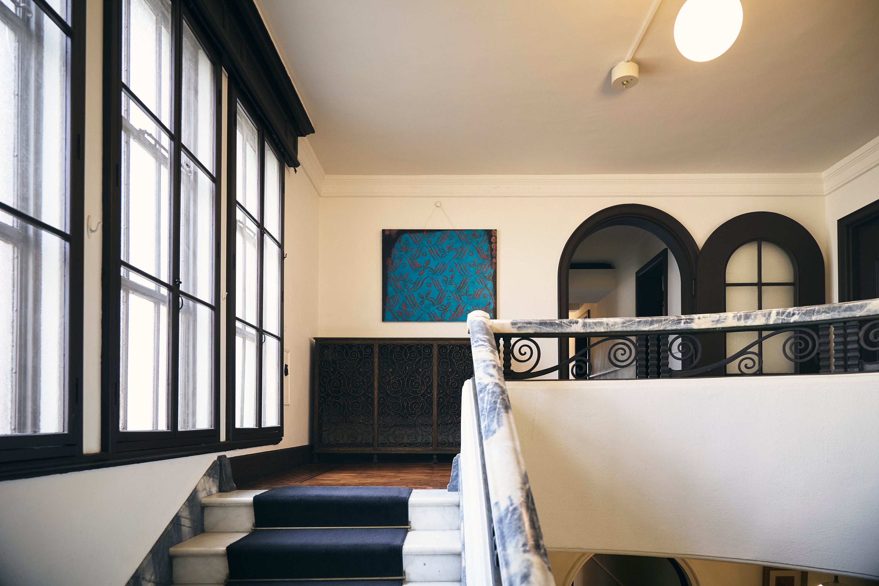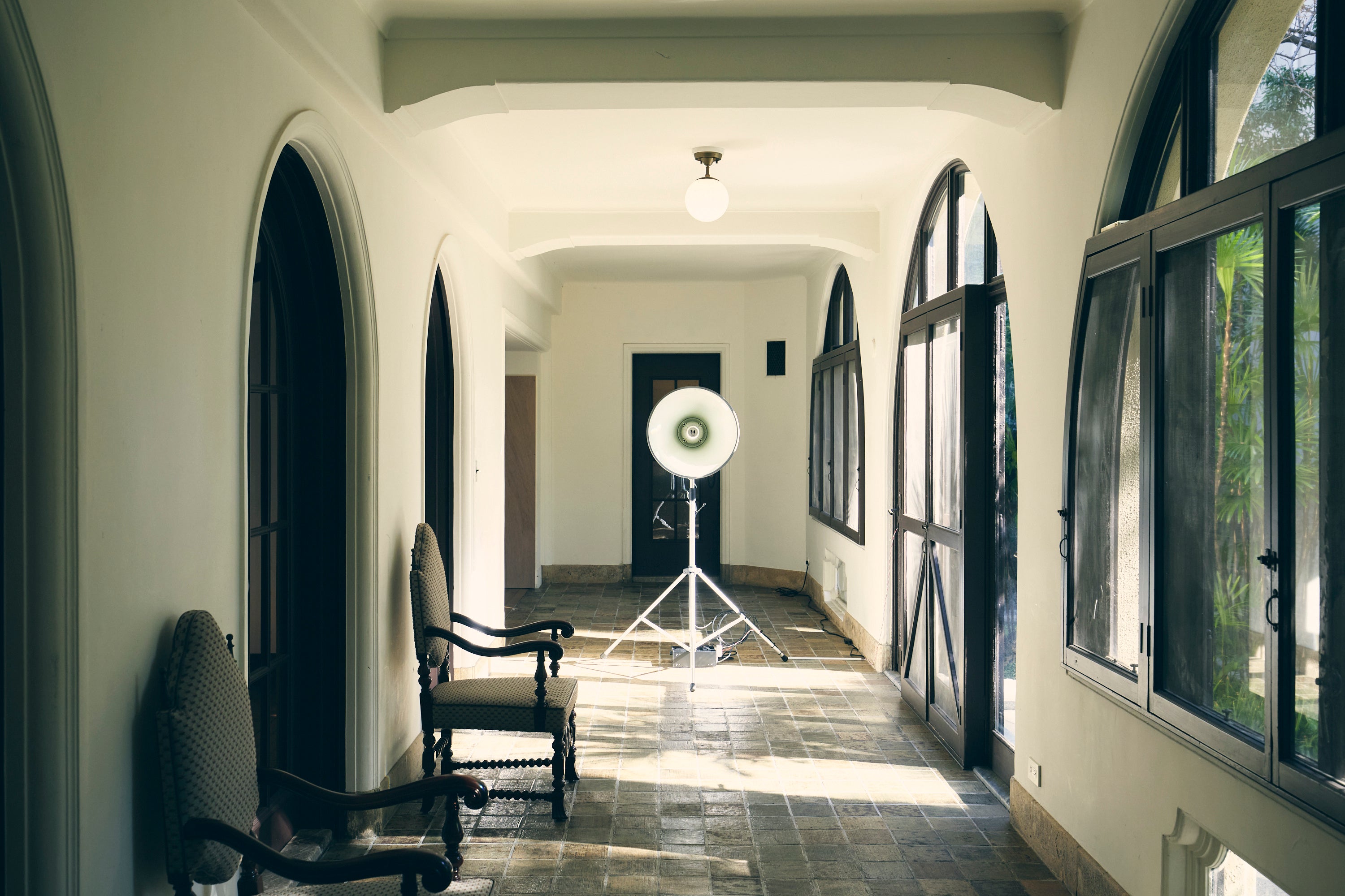 鑑賞の合間には、普段は非公開の邸宅の3階バルコニーを開放した「期間限定カフェ」で特別なひとときをお過ごしいただけます。 スパニッシュ様式の瓦屋根やアーチ窓、そして眼下に広がる庭園の緑を眺めながら、コーヒーやドリンクを楽しめる贅沢な空間です。歴史の重みや作品の思考に触れた後、心地よい風に吹かれながら展覧会の余韻(あいまいさ)に浸る、ここだけの時間をご提供します。