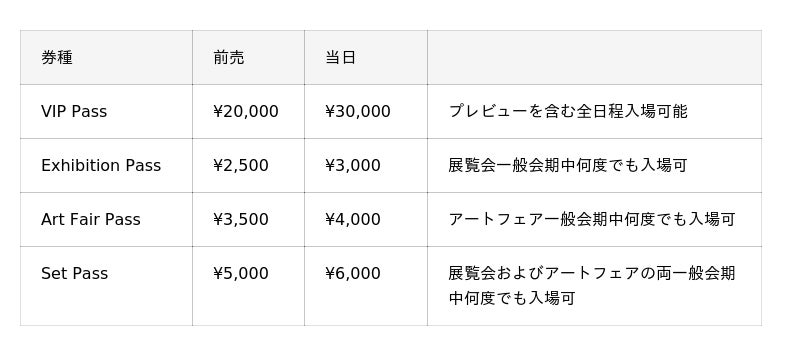 各作品や長編の映像作品、関連書籍をじっくり鑑賞してほしいという思いから、一般会期中何度でも入場可能なチケットとなっています。また、同会場で開催する約20軒のギャラリーによるアートフェア(2月13日(金)~2月15日(日))にも入場できる、お得なセットパスもご用意しています。