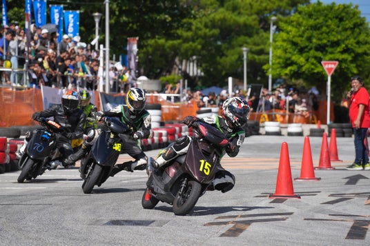 オンロード会場では、ドリフトとミニバイクのデモ走行が行われ、迫力のエンジン音や走行に歓声が上がりました。