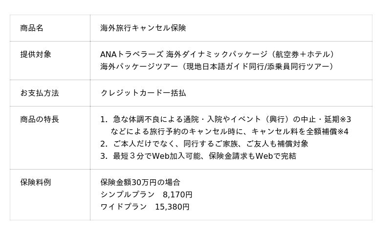 ANA X株式会社(本社:東京都中央区、代表取締役社長:神田 真也、以下「ANA X」)、ANAファシリティーズ株式会社(本社:東京都中央区、代表取締役社長:近藤 博之、以下「ANAファシリティーズ」)、損害保険ジャパン株式会社の子会社で少額短期保険業を営むMysurance(マイシュアランス)株式会社(本社:東京都新宿区、代表取締役社長:清水 廣臣、以下「Mysurance」)は、ANAトラベラーズ 海外ダイナミックパッケージ(航空券+宿泊)および海外パッケージツアー(現地日本語ガイド同行/添乗員同行ツアー)の予約と同時に、簡単かつシームレスに手続きが可能な「海外旅行キャンセル保険」のご案内を2025年12月17日より開始します。
