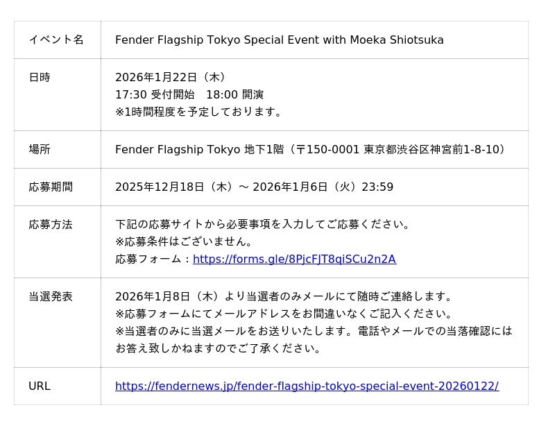 - 本イベントの様子を公式SNS、公式オンラインメディア「FenderNews」、およびフリーペーパー「FenderNewspaper」、その他外部メディアに掲載させていただく場合がございます。応募フォームよりご応募いただいた方は、お客様のお写真を含め、記事の掲載に同意いただいたものとみなさせていただきます。