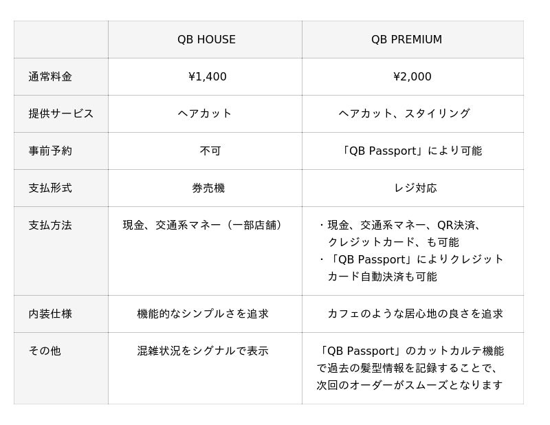 既存のQB HOUSEと比べて、より便利に快適な空間でご利用いただくことを目的としており、スマホアプリ「QB Passport」をご利用いただくことで便利に快適にご利用いただけます。「QB Passport」についてはコチラをご参照ください。また、「QB HOUSE」と「QB PREMIUM」との違いについては、下記のとおりです。