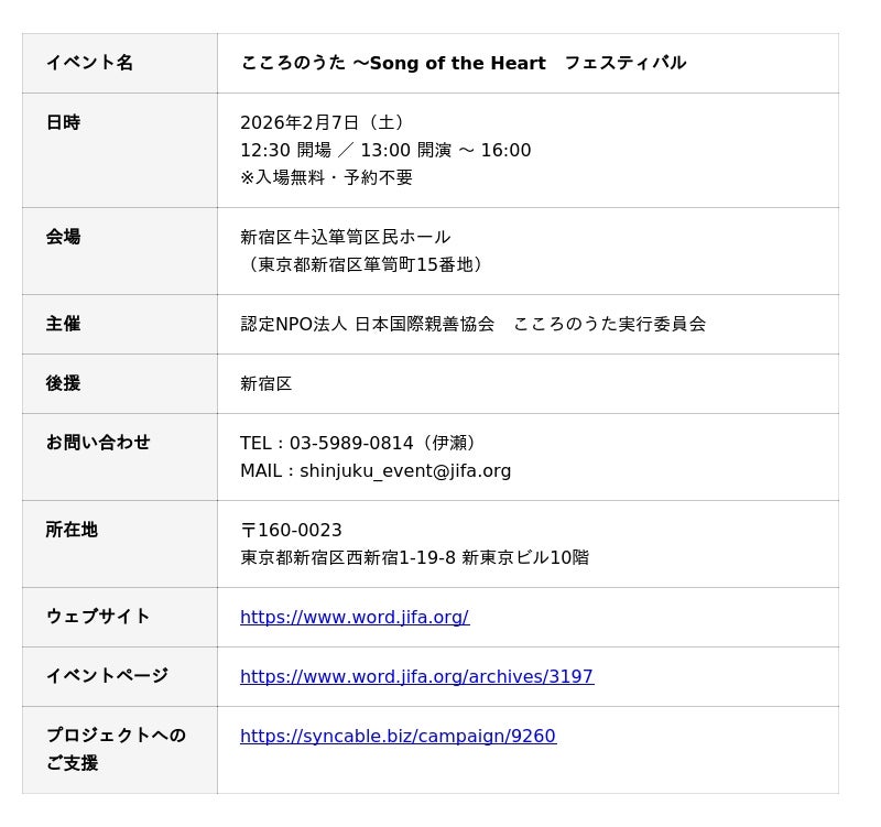 認定NPO法人日本国際親善協会(東京都新宿区)が運営する「こころのうた実行委員会」は、2026年2月7日(土)、新宿区牛込箪笥区民ホール にて、音楽を通じた国際交流イベント