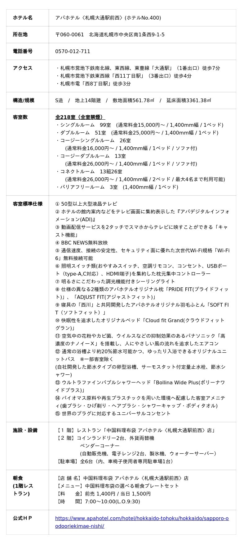 アパホテル〈札幌大通駅前西〉公式HP:https://www.apahotel.com/hotel/hokkaido-tohoku/hokkaido/sapporo-oodooriekimae-nishi/