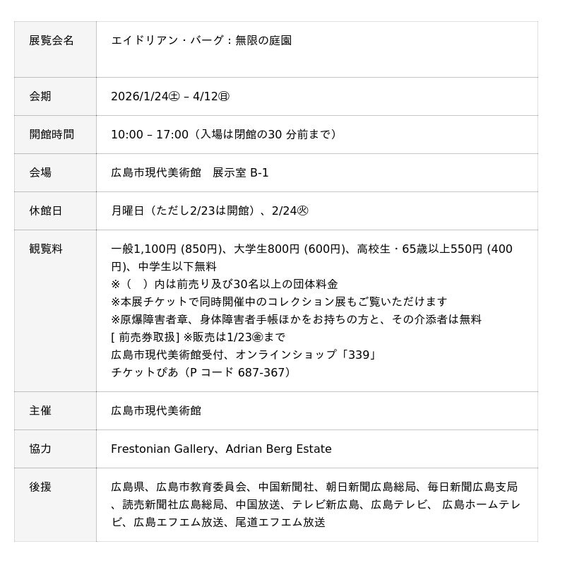 広島市現代美術館は、エイドリアン・バーグ(1929-2011)の日本における初個展「エイドリアン・バーグ:無限の庭園」を開催します。バーグはそのキャリアの初期から晩年まで一貫して風景画を追求し、特に、1960年代からの約20年間、自身がアトリエを構えたイギリスのリージェンツ・パークを繰り返し描いたことで知られています。ひとつのキャンバスに複数の空間表現や異なる時間軸を織り込む独自のスタイルは、その後、イギリス各地の庭園や旅先の風景へと主題が広がる過程でさらなる展開を見せています。