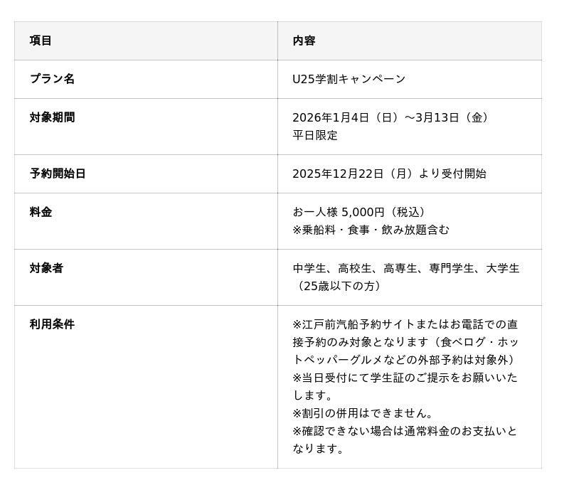 株式会社江戸前汽船(本社:東京都江東区、代表取締役:[代表者名])は、2026年1月4日(日)から3月13日(金)までの平日限定で、中学生から大学生(専門学生含む)を対象とした特別プラン「江戸前汽船 U25学割キャンペーン」を実施いたします。