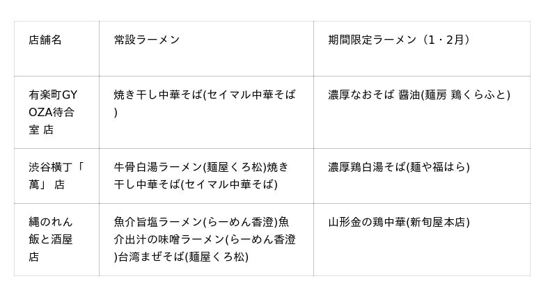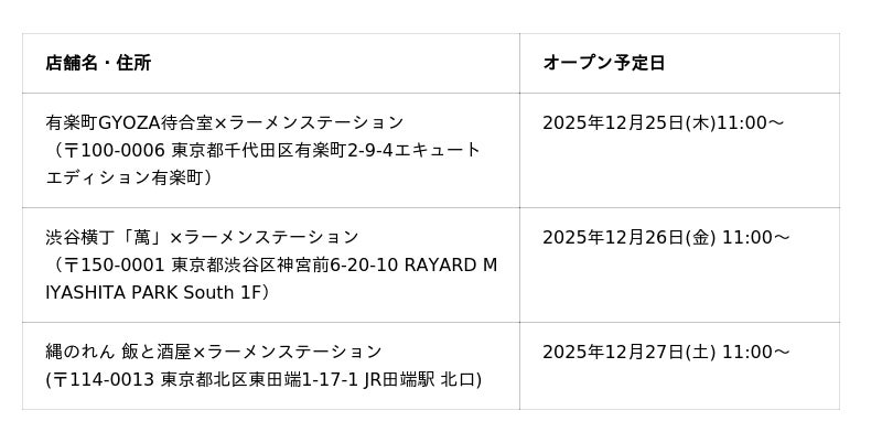※上記3店舗は12月下旬オープンのため、初回の期間限定ラーメンは2ヶ月超(2026年2月末日)までの提供を予定しております。