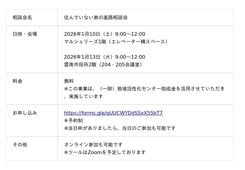 公益財団法人うんなんコミュニティ財団(島根県雲南市、代表理事 郷原剛志)は、2026年1月10日及び1月13日に[住んでいない家の進路相談会]を開催します。この相談会は、島根県雲南市に空き家等の不動産を所有している人を主なターゲットとし、利活用事例や相続・登記等を専門家に相談することを通じて、地域で不動産利活用が促進されることを目指しています。