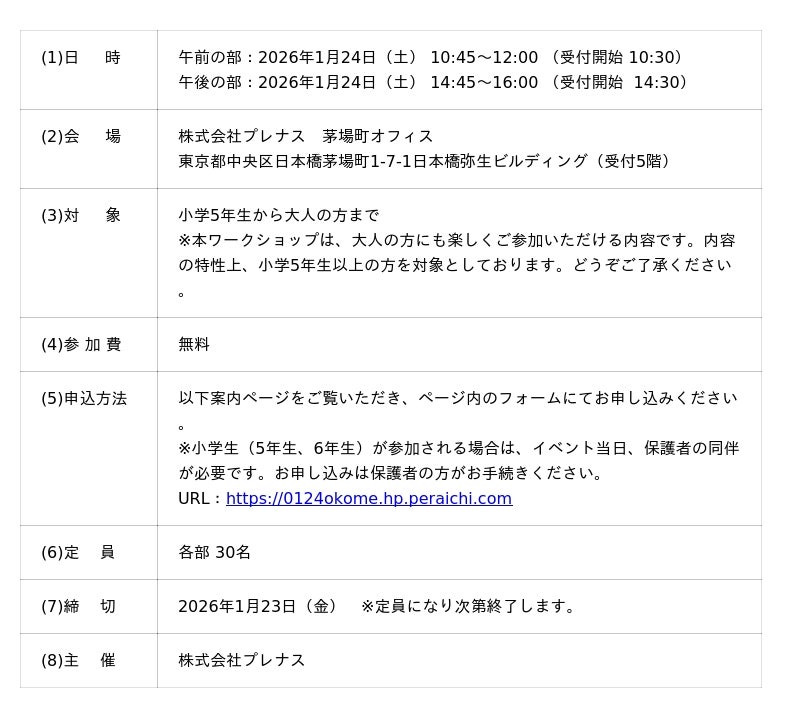 当社は、日本の米食文化の魅力を次世代へつなぐ取り組みとして、「米育(こめいく)」を推進しています。その一環として2019年より開催している「お米のワークショップ」は、毎回多くの皆さまからご好評をいただいております。そこでこのたび、「お米のワークショップ」を2026年1月24日(土)に、プレナス茅場町オフィス(中央区日本橋茅場町)にて開催いたします。今回は、通常4種類のところを特別に6種類のお米をご用意し、食べくらべをお楽しみいただけます。