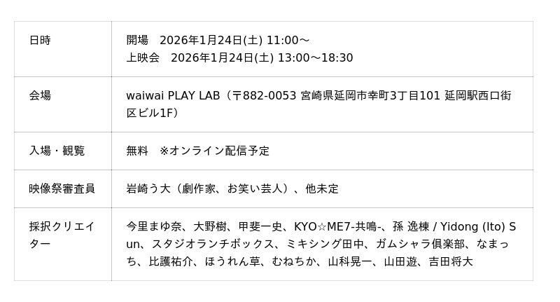 クリエイターらが制作した映像を市民にお披露目する場として、延岡市のケーブルメディアワイワイが運営する動画を軸にしたエデュテインメント施設「waiwai PLAY LAB」にて1月24日(土) に映像祭を開催します。