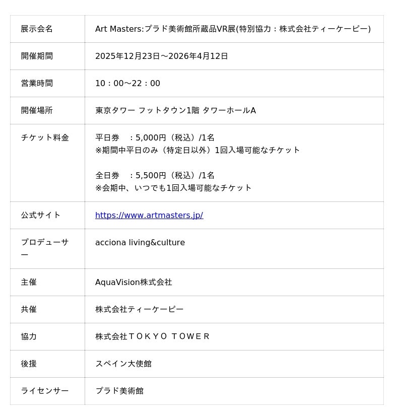 【株式会社ティーケーピー 代表取締役社長 河野貴輝 コメント】「本日、東京タワーという日本を象徴する場所で、世界最高峰・プラド美術館の名画をVRで体験できる展覧会をスタートできたことを大変嬉しく思います。本展はAquaVisionとの提携による第一弾の取り組みで、TKPにとってコンテンツ事業への新たな挑戦です。今後は本展を皮切りに、全国の施設や空間を活用しながら、VRをはじめとする体験型コンテンツを文化・芸術・エンターテインメント分野へ広げ、空間価値のさらなる創出に取り組んでまいります。」