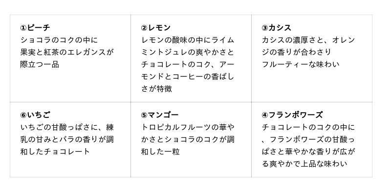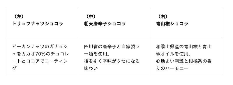そして、スーツァンレストラン陳では料理長・関根忍が手がける四川料理のスパイスを効かせた3種のフレーバーを1箱に。唐辛子や青山椒など、四川のエッセンスとショコラの絶妙な組み合わせをぜひお楽しみください。