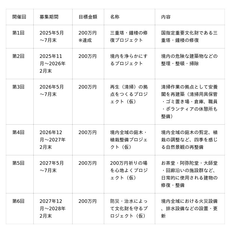 環境整備にかかる費用はクラウドファンディングで寄付を募っています。目標金額と用途が明確化された短期間で寄付を呼びかける全6回のショート寄進と、創建1300年を迎える2028年まで再生プロジェクトの応援を募るロング寄進によって再生の歩みを、みなさんと一緒に進めていきたいという住職の願いが込められました。