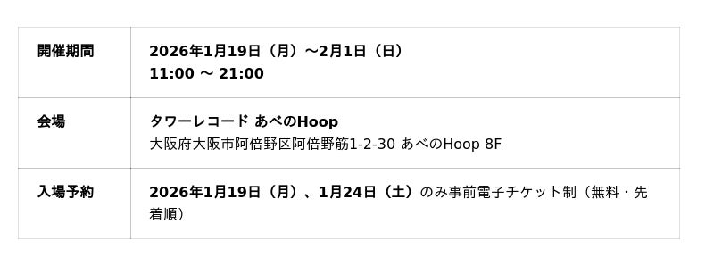 お客様の混雑緩和・安全対策等のため、2026年1月19日(月)、1月24日(土)の一部時間のみ事前の先着受付による電子チケット制(無料)とさせていただきます。整理券の受付開始日や詳細については、特設サイトおよびAnique公式X(@anique_jp)にて発表いたします。 随時情報を更新いたしますので、ご確認ください。