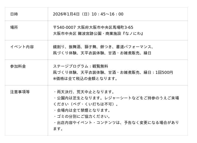 『難波宮跡公園「みんなのにわ」プロジェクト(以下「本グループ」)』(代表構成員︓NTT 都市開発株式会社)は、難波宮跡公園(北部ブロック)整備運営事業 の一環として、大阪市中央区の難波宮跡公園および隣接する商業施設『なノにわ』において、「なノにわ新春祭」を2026年1月4日(日)に開催することをお知らせします。