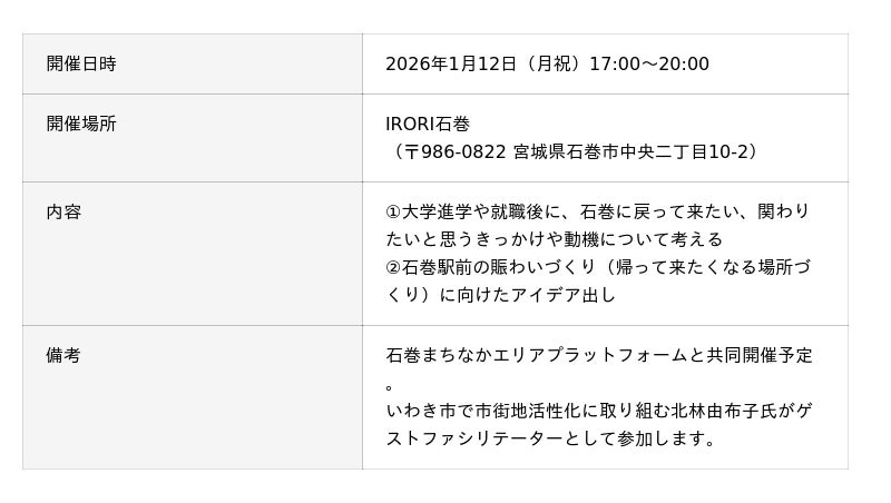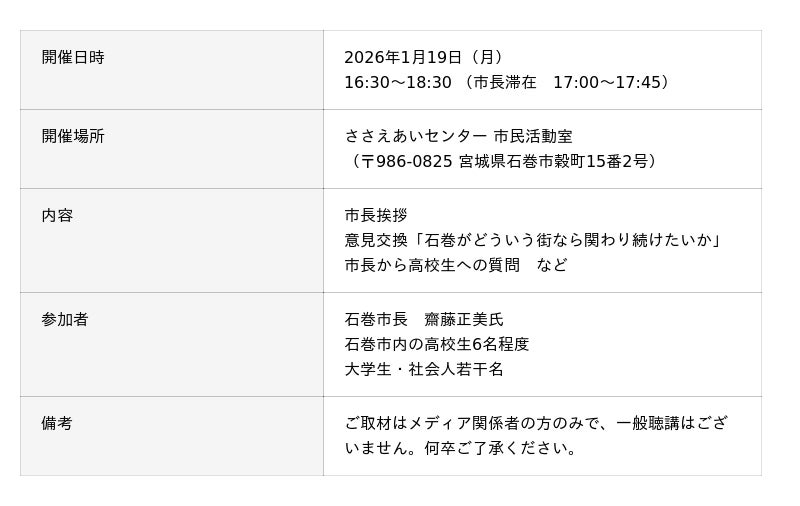 宮城県石巻市で高校生の自己実現を支援する一般財団法人まちと人と(宮城県石巻市、代表理事:斉藤誠太郎)は、市長と若者が『関わり続けたいまち』を考える懇談会を2026年1月19日(月)に開催します。