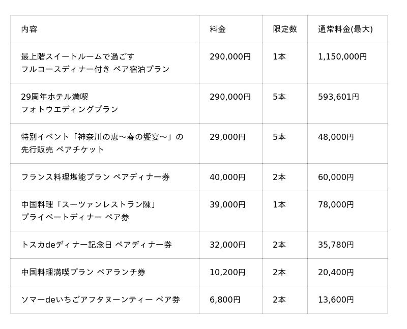 2026年に開業29周年を迎えるにあたり、”29”にちなんだ価格で大変お得なプランをバラエティー豊かに取り揃えます。宿泊券はもちろん、3月に予定している特別イベント「神奈川の恵~春の饗宴~」の先行販売チケットや、ウエディング限定プランの抽選販売など最大50%offの様々なシーンでお楽しみいただけるラインナップです。