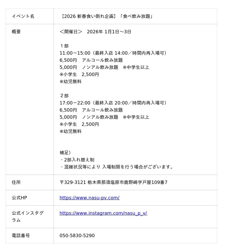 国内、L.A.に47店舗のレストランを展開をしている株式会社グローバルダイニング(本社:東京都港区南青山7丁目/代表取締役社長:長谷川耕造)は、那須パラダイスヴィレッジにて 、2026年1月1日(元日)から3日までの3日間、【2026 新春食い倒れ企画】「食べ飲み放題」 を開催いたします。隣接する那須ガーデンアウトレットの初売りへお越しのお客様も、お買い物の合間のひととき ゆったりとボリューム満点な食事をお楽しみいただけます。
