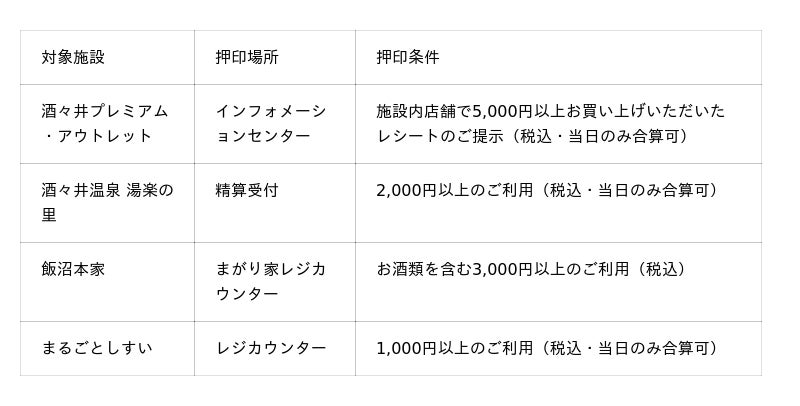■参加施設:酒々井プレミアム・アウトレット、酒々井温泉 湯楽の里、飯沼本家、まるごとしすい