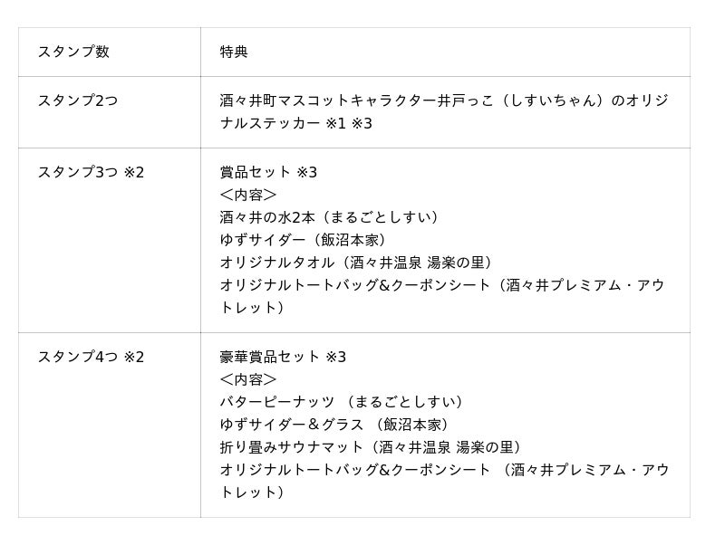 本スタンプラリーは、酒々井町の魅力を発信し、町内の観光・周遊を促進するために4施設が連携して企画したもので、2020年に初開催し、今回で4回目の開催となります。対象施設でのお買い物やご利用で、スタンプラリーの台紙に押印します。スタンプを2つ集めた方にはオリジナルステッカーをプレゼント、3つ集めると各施設のノベルティなどを集めたセットをプレゼント。そして4つ全て集めた方には、さらに豪華な賞品セットとして、「飯沼本家」による「ゆずサイダー」とグラスのセットや、「まるごとしすい」からは酒々井町産のピーナッツを使った「バターピーナッツ」、「酒々井温泉 湯楽の里」からはサウナマット、「酒々井プレミアム・アウトレット」の対象店舗で特典が受けられるクーポンシートなど魅力たっぷりの詰め合わせをプレゼントします。