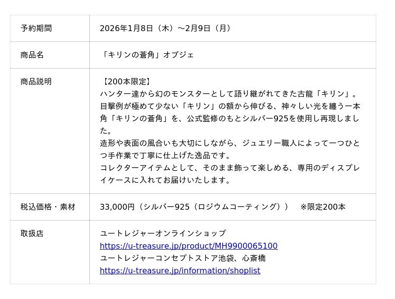 株式会社ユートレジャー(本社:東京都新宿区、代表取締役社長:青木 興一、株式会社ケイ・ウノの連結子会社)は、株式会社カプコンが展開するハンティングアクションゲーム「モンスターハンター」シリーズとコラボレーションした「キリンの蒼角」オブジェの予約受付を2026年1月8日(木)~2月9日(月)の期間、ユートレジャーオンラインショップ、ユートレジャーコンセプトストア池袋、心斎橋(2026年1月16日(金)オープン)にて行います。200本の数量限定です。