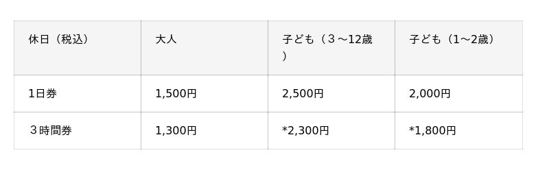 [団体割引]子ども15名以上の利用は団体扱い。大人900円、子ども(3~12歳)1,700円、子ども(1~2歳)1,200円。貸切利用も可能です