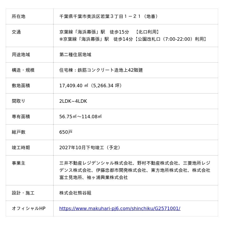 本物件は、「幕張ベイパーク クロスタワー&レジデンス」(2019年2月竣工)、「幕張ベイパーク スカイグランドタワー」(2021年2月竣工)、「幕張ベイパーク ミッドスクエアタワー」(2024年2月竣工)、「パークウェルステイト幕張ベイパーク」(2024年9月開業)、「幕張ベイパーク ライズゲートタワー」(2026年2月竣工予定)に続く第6弾となり、若葉3丁目公園を望む最後のタワーレジデンスです。