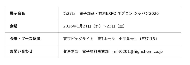 グローバルに事業を展開する化学品商社兼メーカーのハイケム株式会社(本社:東京都港区、代表取締役社長:高 裕一、以下「ハイケム」)は、2026年1月21日(水)~23日(金)に東京ビッグサイトにて開催される「第27回 電子部品・材料EXPO ネプコン ジャパン2026」に出展いたします。