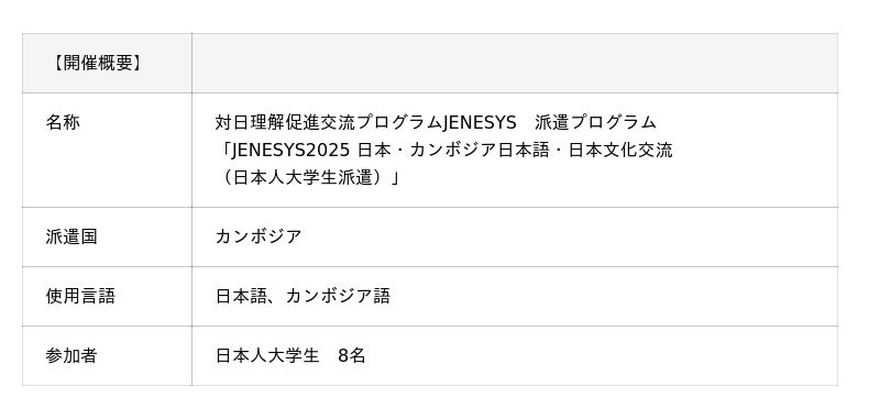将来、日本語教師を目指す日本の大学生8名が「日本語・日本文化交流」をテーマにカンボジアを訪問します。現地では、カンボジアにおける日本語教育の現場を見学することで、将来の活躍の場をイメージするとともに、現地で日本語を学ぶ学生との交流を行い、互いの友好を深めます。