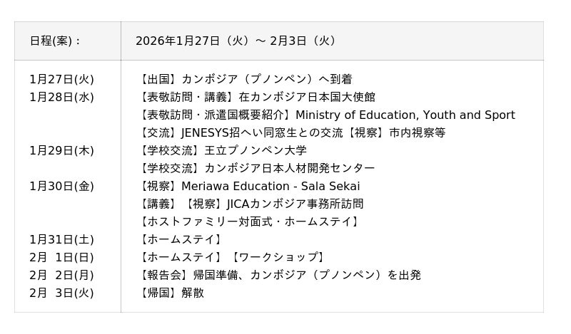 本プログラムは、外務省が推進する国際交流事業「対日理解促進交流プログラムJENESYS」の一環として行われる派遣プログラムです。