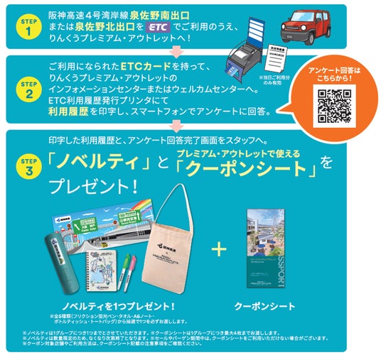 この企画では、阪神高速4号湾岸線の「泉佐野南」、「泉佐野北」のいずれかの出口をETCでご利用のうえ、りんくうプレミアム・アウトレットにご来場いただいたお客さまに、「ノベルティグッズ」ならびにアウトレットショッピングがお得になる「クーポンシート」をプレゼントいたします。(プレゼント条件は下記参加方法を、クーポン利用条件は券面の注意事項をご確認ください)
