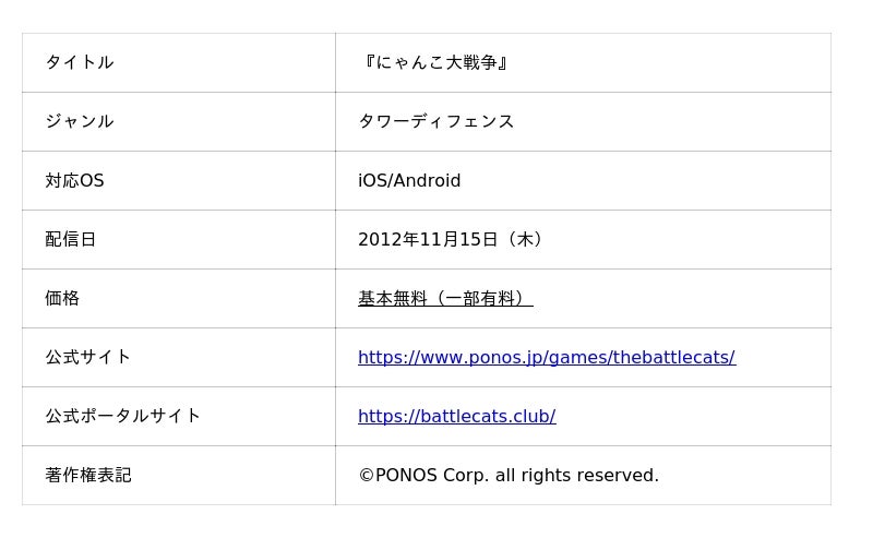 『にゃんこ大戦争』は、iOS・Android向けタワーディフェンスゲームです。プレイヤーは様々な能力を持つ「にゃんこ」たちを編成して、各地を侵略していきます。2012年のリリース以来、個性的なキャラクターや独特の世界観が、日本のみならず世界中の多くのお客様にご支持をいただいています。今後も多様なメディア展開やコラボレーションを積極的に行ってまいります。