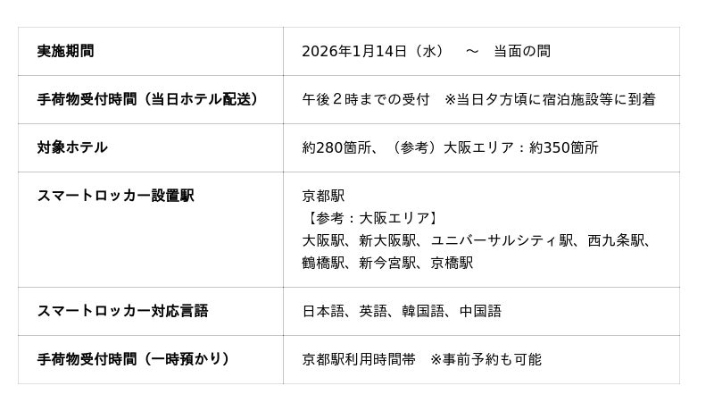 新たに京都駅在来線中央口(烏丸口)へのスマートロッカーの設置に伴い、京都駅での受付や京都市内へのホテル配送も可能となり、更に便利にスマートロッカーをご利用いただけます。