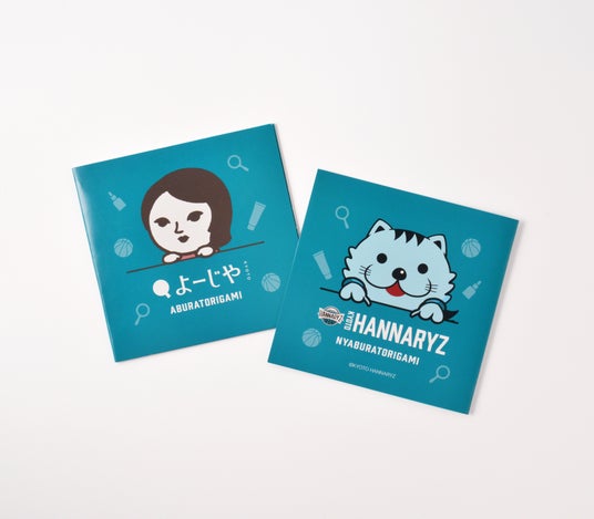 コーポレートキャラクター「よじこ」と京都ハンナリーズのマスコットキャラクター「はんニャリン」の初コラボデザインのあぶらとり紙です。ハンナリーズのチームカラーである花浅葱色をベースに、表面には「はんニャリン」、裏面には「よじこ」がひょっこりこちらをのぞいています。