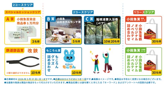 クリアしたコース数に応じて、駅で使用していた「改(かい)鋏(きょう)」や「小田急百貨店商品券(1万円分)」、「山のホテルランチ券」「もころんグッズ詰め合わせ」などの賞品が当たる抽選にご参加いただけます。