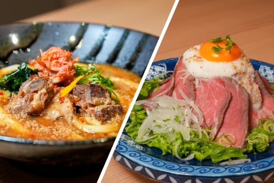 黒豚踊る、和食仕立ての桜島カレーうどん / 至福の肉の山、桜島ローストビーフ丼 / 提供店舗:おじゃったもん屋
