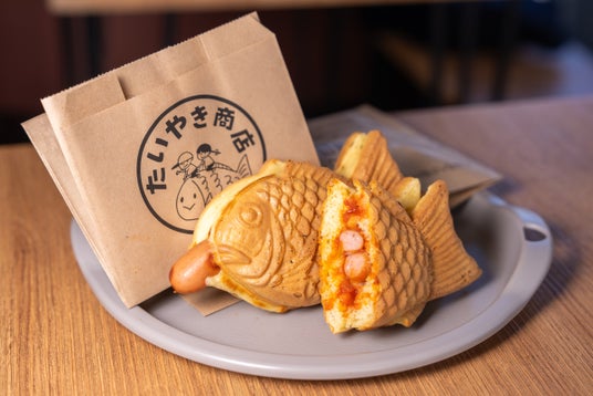 たい焼きが叫ぶ、ドカーン!中身はまさかのチリドッグ。鹿児島県産ウインナーがたい焼きの口からちょこんとはみ出し、今にも噴火寸前。たいやき商店と天文館のたいあん、両店で楽しめる期間限定マグマ飯。友達とシェアして写真も必須の一品!