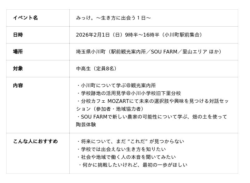 進路や将来について考える機会が増える一方で、「自分が何をしたいのか分からない」「このままで大丈夫なのか不安」 と感じる中高生も少なくありません。今回の企画者である自由学園の高校生2人も、まさにその当事者でした。こうした思いを出発点に、 高校生2名が自ら企画・広報を担当し、 中高生向けのフィールドワークイベント『みっけ。~生き方に出会う1日~』を企画しました。舞台となる埼玉県小川町は、有機農業をはじめとした地域実践が積み重ねられてきた場所です。 地域の協力者は、「教える側」としてではなく、次世代とともに考える存在として本企画に関わります。中高生が地域と出会い、地域もまた中高生のリアルな声に触れる、双方向の学びの場を目指しています。