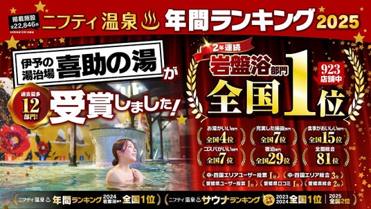▲ニフティー温泉 2年連続 岩盤浴部門 全国1位を受賞