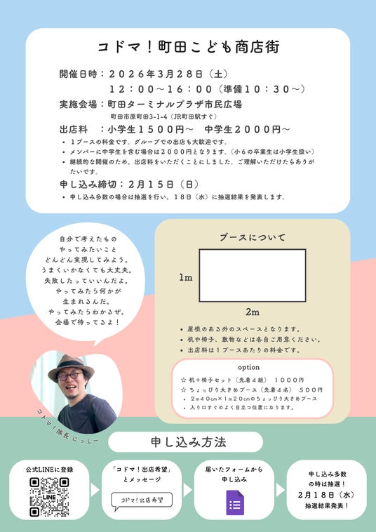 NPO法人まなクロ(東京都町田市、代表理事:西山 絢)は、小中学生が自分で考えたお店を出店する社会体験イベント「コドマ!~町田こども商店街~」を2026年3月28日(土)に町田ターミナルプラザ市民広場にて開催します。現在、出店者を募集中です(申込締切:2月15日)。