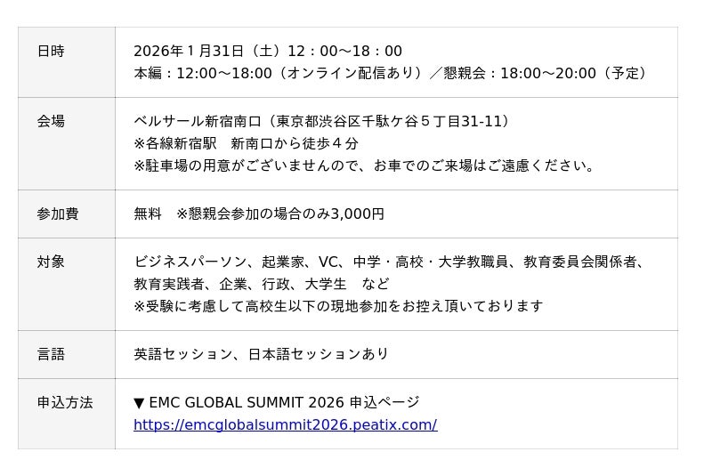 - 武蔵野大学アントレプレナーシップ学部と一般社団法人EMC GLOBALが共催する「EMC GLOBAL SUMMIT2026」が2026年1月31日(土)にベルサール新宿南口にて開催