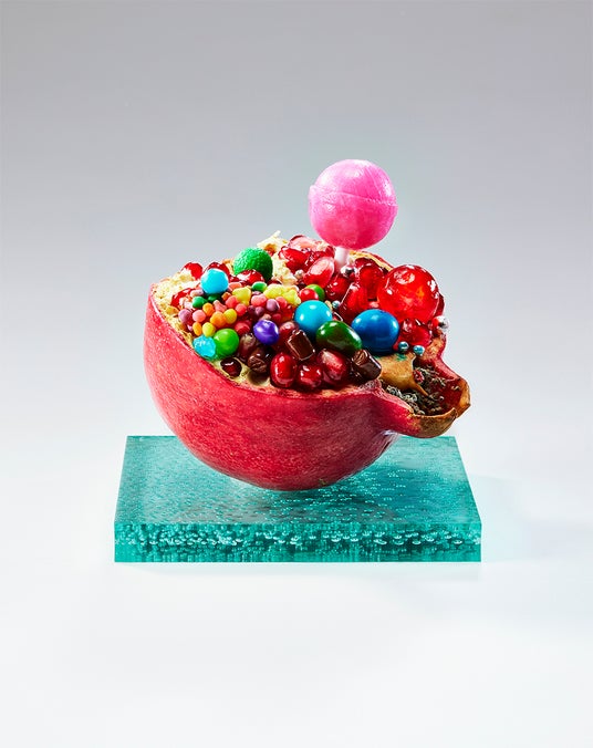 裂けたざくろから宝石のようなキャンディがあふれ出し、鮮烈な甘さを感じさせる作品。ここで向き合わされるのは、天然甘味料と人工甘味料――どちらも良くて、どちらも悪いという現実。健康的で安心感のある自然の甘味も、手軽さや快楽を約束する人工の甘さも、私たちの生活に深く溶け込み、完全に避けることはできません。本作は全4点からなるシリーズで、ざくろやオレンジなど、果実が宿す自然の甘味と、キャンディーやチョコレートに象徴される人工の甘さを並置し、対比させながらも同じ場に共存させます。