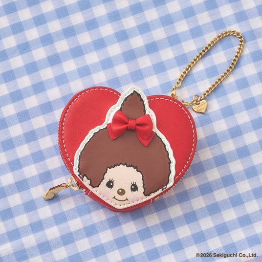 「モンチッチちゃん」の愛らしい顔をワッペン風にデザインしたハート型ポーチ。