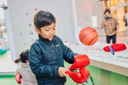 子どもたちは、まず【バスケットボール(バスケ)】、【ボクシンググローブ(ボクシング)】、【ケーキ(おかしづくり)】、【ギター(演奏)】、【漫画用つけペン(まんが)】の5つのアイテムからひとつ、自分の“やりたい!”を選びます。選んだアイテムを手に、LEDで囲まれたスタジオに入り、映像とともに各テーマの世界観を体験。アイテムを手にポーズを決める子や、少し恥ずかしそうにしながらも挑戦する子など、それぞれが”やりたい!”の世界に入り込む様子が見られました。